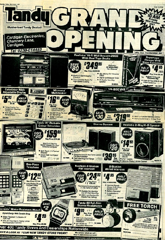 During that re-fit  I was approached by Brian Bennet of Tandy Inc. (USA)  to take on a RadioShack  Dealership in Cardigan, (see local paper notice below,) and for the next decade became one of the busiest Tandy Dealers in Wales until Tandy pulled out of the UK in the late 90’s.  Mike